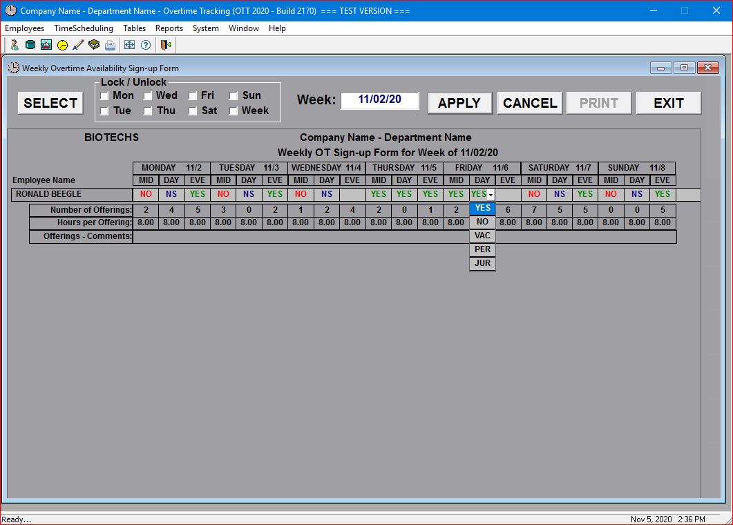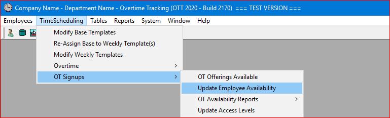 Select the TimeScheduling | OT Signups | Update Employee Availability main menu option.