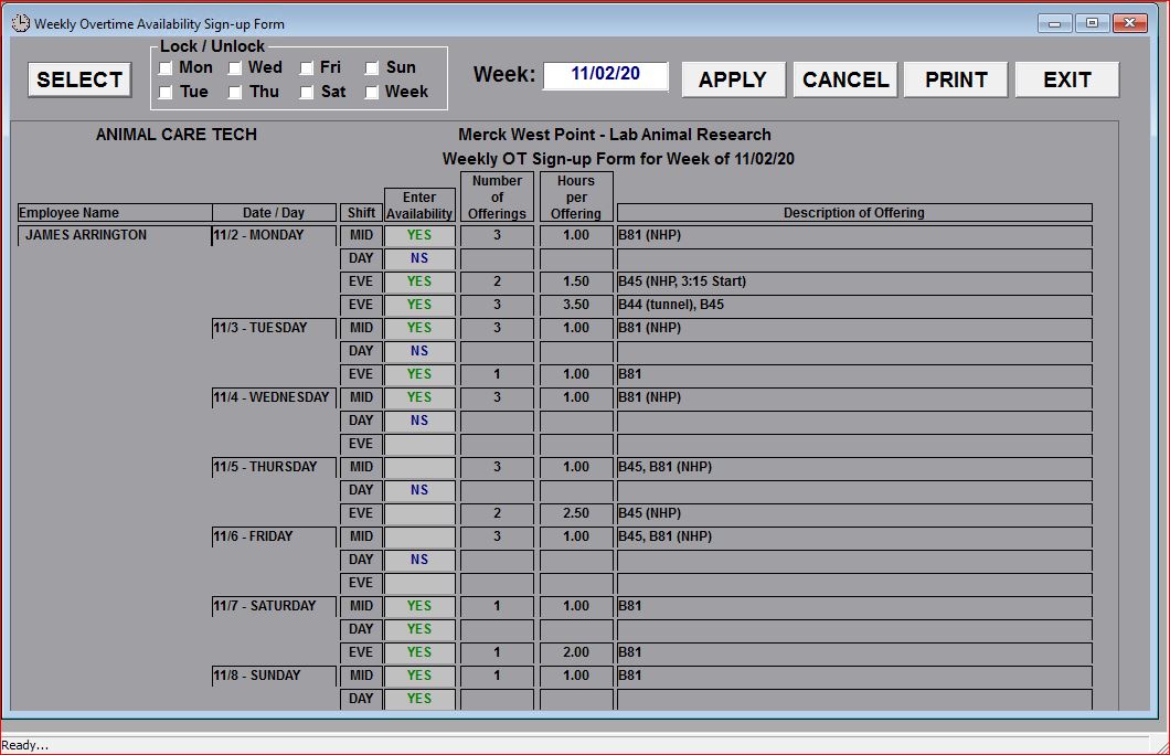 Note that ALL updates to an employee's availability are logged by the system for tracking purposes whether entered by the employees themselves or entered by a Supervisor along with identification as to who applied the update for the employee's availability.
