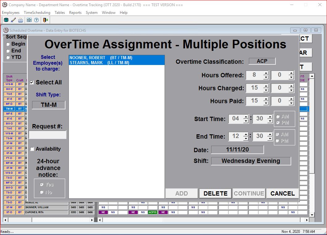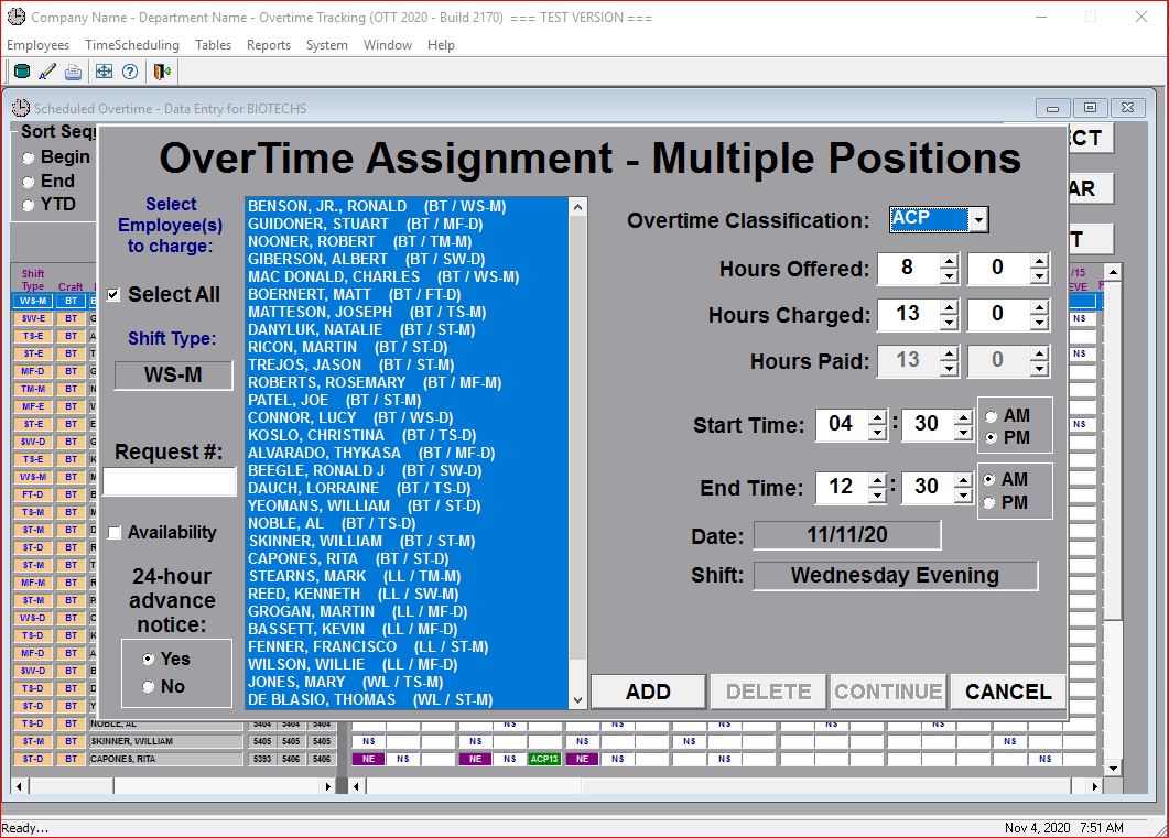 Click on the ADD button and the system will update the Overtime Schedule as well as the total charged hours for each of the employees selected on the list.
