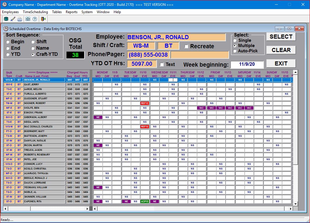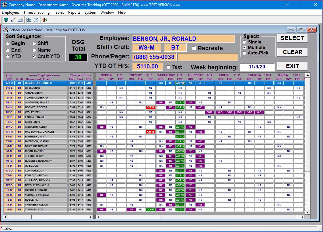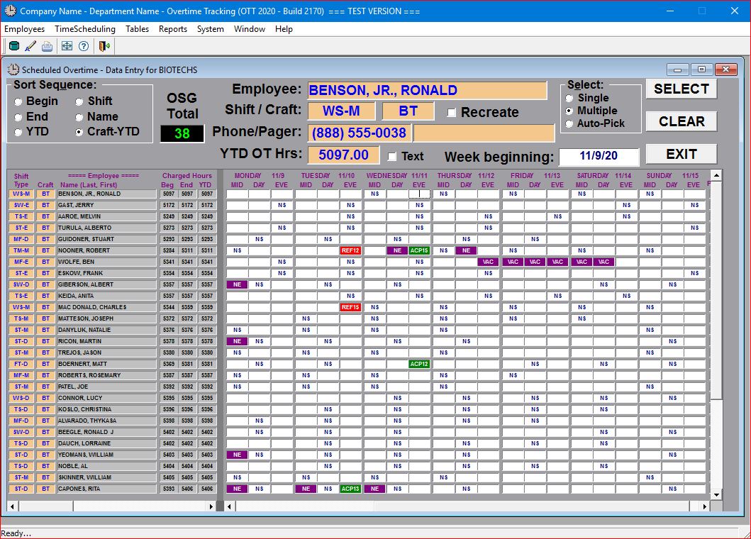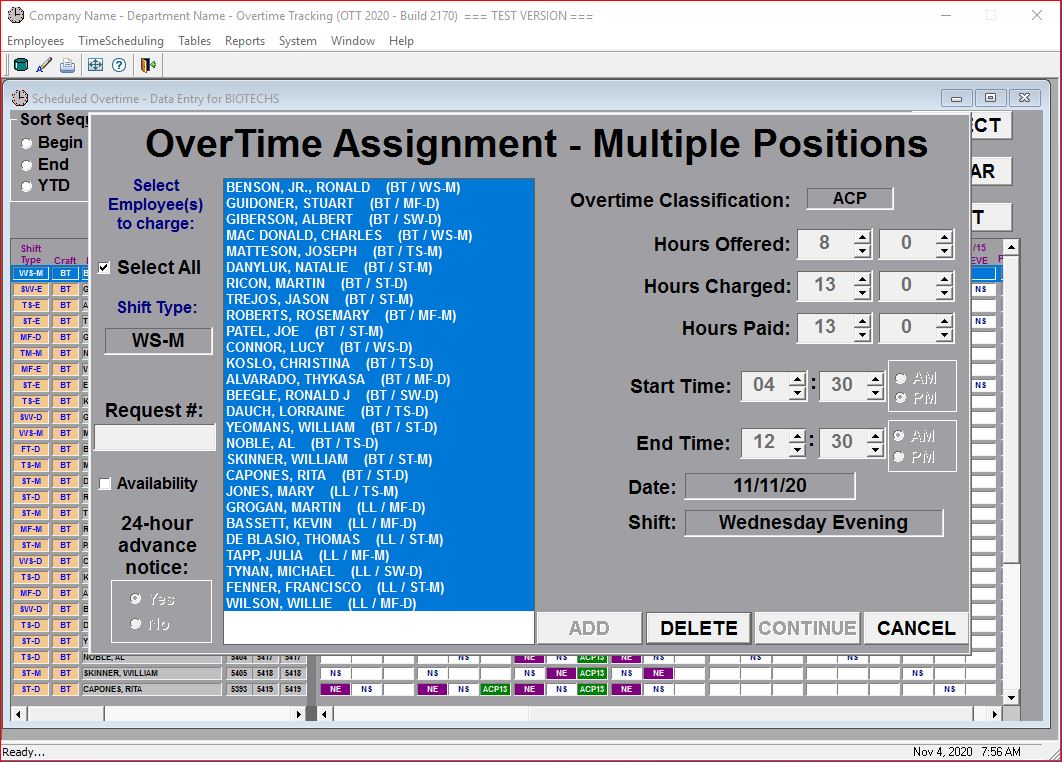 If you select the Multiple option at the top of the screen, then "double-click" on a "cell" in the Overtime Schedule, the system displays the "multiple" version of the standard "pop-up" window. This version is very similar to the standard version, but contains a list box of employees in low-hour order who are available for this overtime assignment. You have the option of selecting as many employees as you want from this list and each employee will be assigned the same overtime offering:
