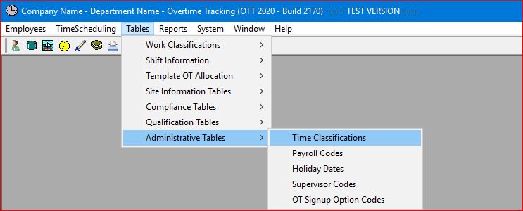Select the Tables | Administrative Tables | Time Classifications main menu option.