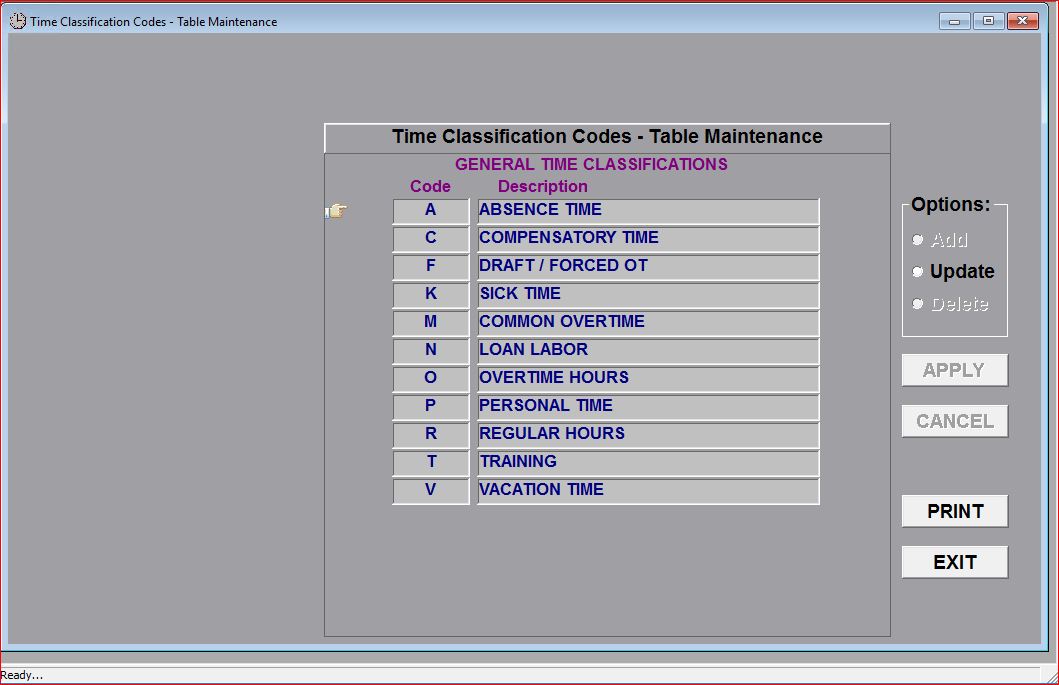 The Time Classifications Code Table maintenance screen ONLY allows you to Update the Description for existing codes, and is, otherwise, hard-coded by the system since these codes are used to categorize different types of regular work, overtime work and absence hours.