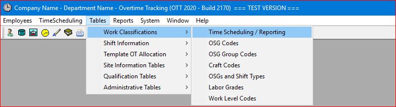 Select the Tables | Work Classifications | Time Scheduling / Reporting main menu option.